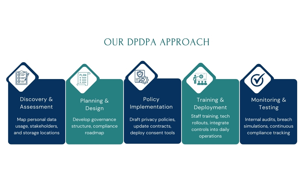 At JVB & Co., a DPDP consultant offer a comprehensive suite of services to help organizations across industries assess, implement, and maintain compliance with the DPDP Act. Our approach combines legal understanding, operational insight, and technology integration to ensure that your organization stays ahead of regulatory expectations and builds trust with stakeholders.