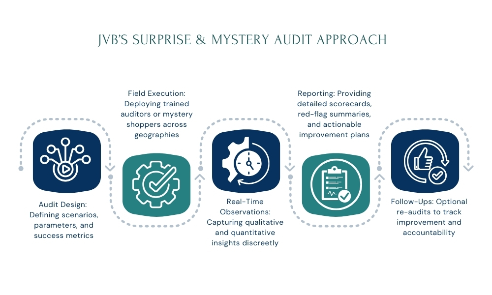 Mystery and unannounced audits bring the power of authenticity, they reflect what your actual customers experience. These audits are critical for organizations seeking to ensure consistent customer service, identify fraud, prevent process deviations, and maintain brand integrity across locations. At JVB, our mystery audit services in Mumbai provide businesses with real-time, unbiased insights that support quality assurance, regulatory compliance, and competitive benchmarking. When performed regularly, these audits become an essential tool for sustaining operational excellence.